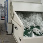 混棉机是将原料输送帘送入,由多根混料辊和输送帘组成一个循环体系,把原料里的块状打开,并将各种不同成分的原料混和均匀,同时要有初步开松除杂作用。